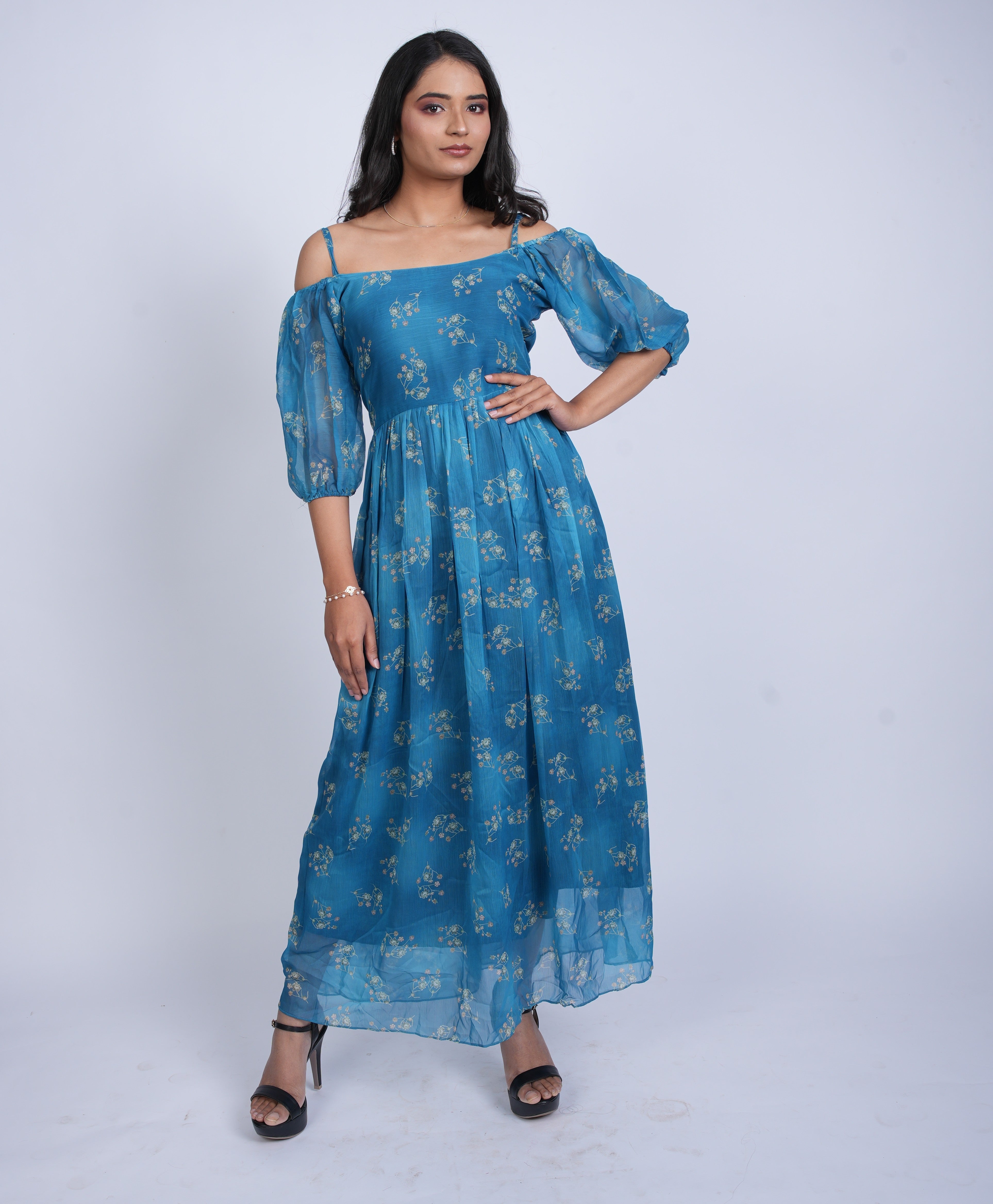 Pair this floral off-shoulder maxi dress with minimal gold jewelry and strappy heels for a polished look. Add a woven handbag or clutch to enhance the aesthetic. Keep your makeup glowy with nude tones to complement the rich blue hue. ๐โจ